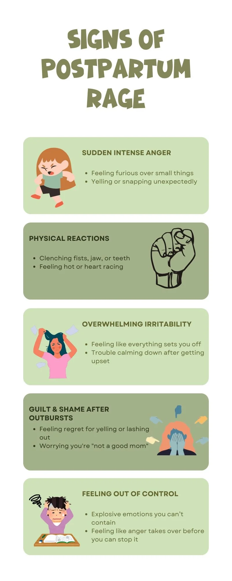 Postpartum rage is often linked to postpartum depression (PPD) or postpartum anxiety (PPA). It can also be a sign of postpartum OCD or PTSD, where intrusive thoughts and fear manifest as anger.